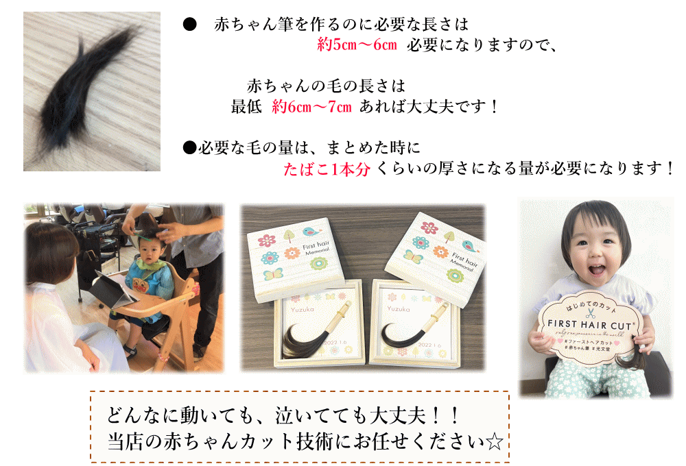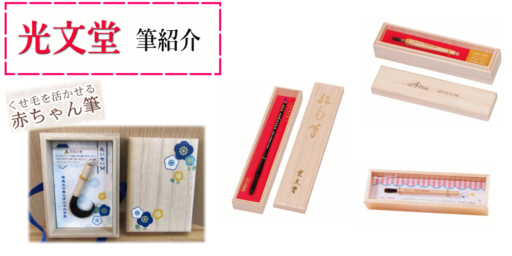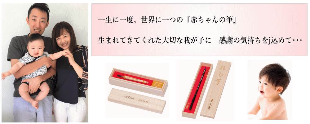 赤ちゃん筆は「胎毛筆」と呼ばれ、古くから生まれた子の頭脳明晰・健やかな成長を祈るために赤ちゃんの髪の毛子供の健やかな成長を願う、両親の深い深い愛情がこめられた、一生に一度の贈り物。子にとっては自分の身体の一部でつくられた「お守り」であり、親にとっては、生まれたばかりの感動をいつまでも鮮やかに蘇らせる宝物です。